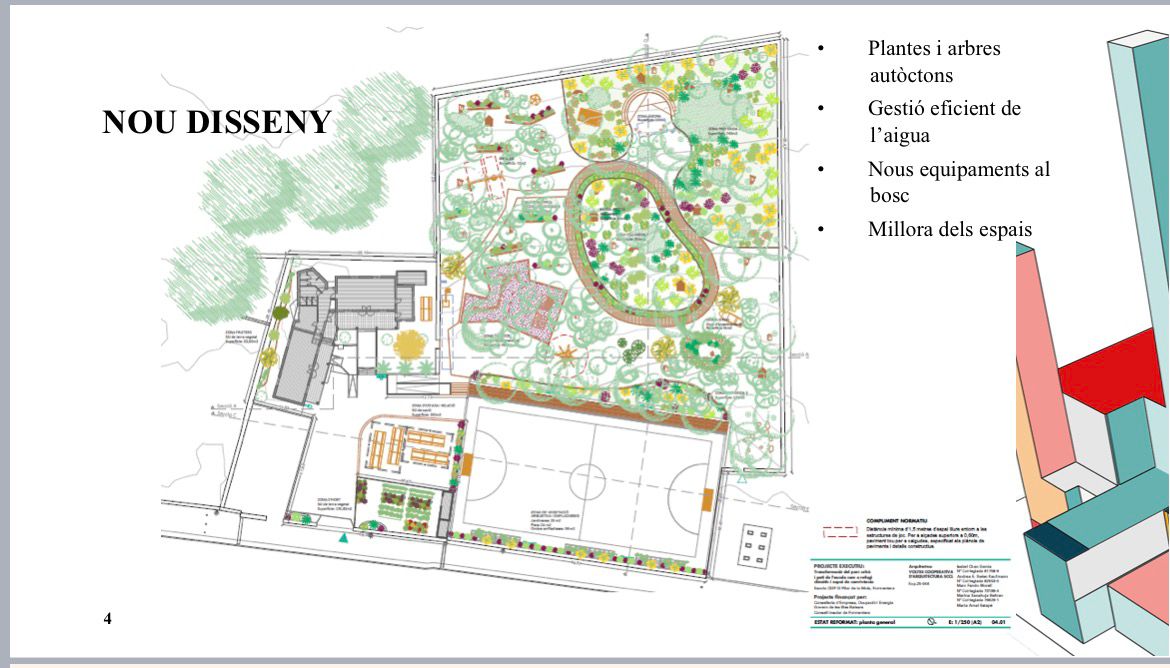 Avui dimarts a les 18 hores es presenta a la Sala de Plens del Consell (de vora el Centre de Dia) el projecte de transformació del parc urbà i el pati del CEIP El Pilar de la Mola en un refugi climàtic i espai de convivència. El projecte, elaborat per Voltes Cooperativa d’Arquitectura, ha estat dissenyat a partir d’un procés participatiu amb la comunitat educativa i el veïnat de la Mola, i té un pressupost de prop de 500.000 euros per a la primera fase, que contempla la intervenció al bosc i a la zona perimetral de la pista esportiva.