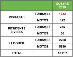 Opció B: derivada de les conclusions assolides en el marc de les reunions de la Sectorial de Mobilitat de la passada setmana, segons ha concretat el Consell. Aquesta proposta manté el sostre vigent durant 2025 i les mateixes condicions de l’any passat del Formentera.eco: igual sostre de turismes de visitants per a la pròxima temporada, 1.732, sense diferenciar els vehicles de treballadors no residents. Així, el sostre de vehicles suma un total de 10.287 vehicles.