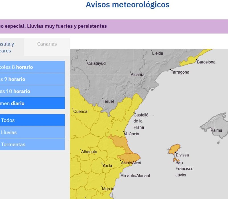 L’Agència Estatal de Meteorologia (AEMET) ha activat l’alerta taronja per a demà dijous a Formentera i Eivissa, amb una probabilitat entre el 40% i el 70% que es produeixin pluges fortes i persistents acompanyades de tempestes. La previsió és que hi hagi