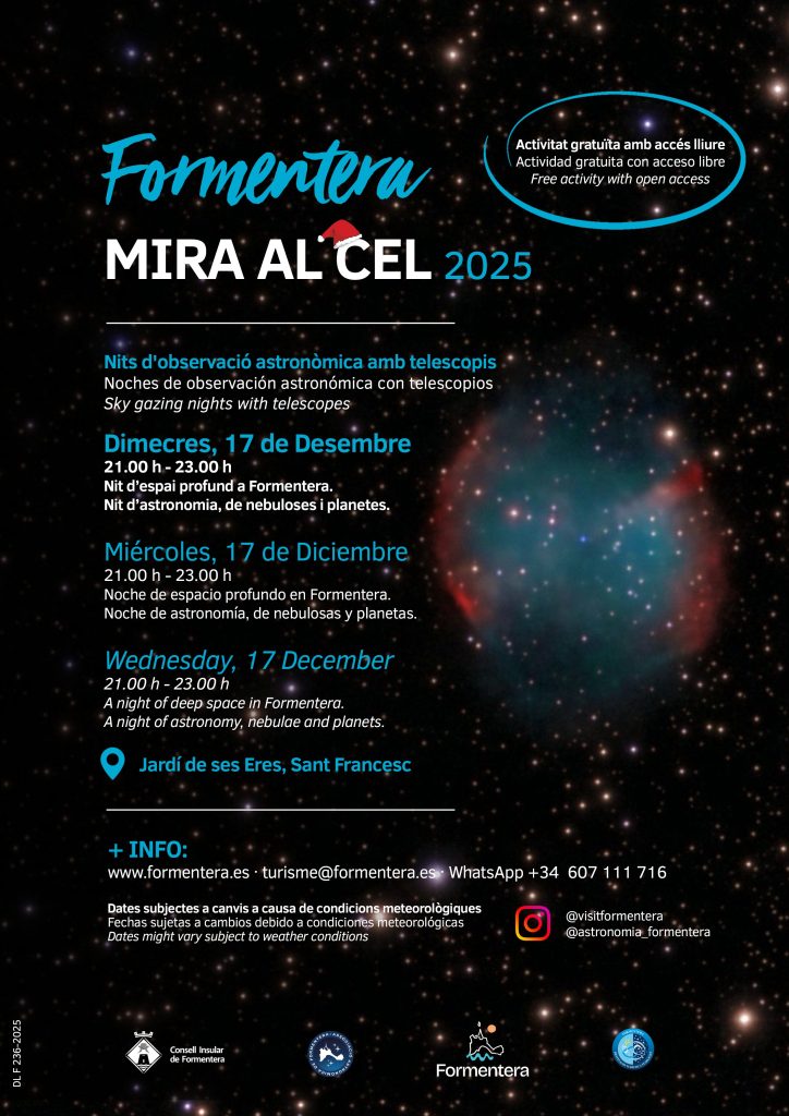 El Consell Insular de Formentera informa en un comunicat que, en col·laboració amb l’Associació Astronòmica, impulsa una nova edició de les observacions astronòmiques d’hivern a través del programa “Formentera mira el cel”, una iniciativa que té com a objectiu “apropar l’experiència de contemplar l’univers a la ciutadania fora de la temporada estival”.