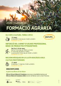 Entre el 9 i el 16 de març tendrà lloc el Curs d’obtenció del carnet d’usuari professional bàsic de productes fitosanitaris, amb una durada de 25 hores. Les sessions es desenvoluparan del 9 al 12 de març, de 16.00 a 21.00 hores, i el 14 de març, de 9.00 a 14.00 hores. La prova final es realitzarà el 16 de març, de 16.00 a 18.00 hores. Aquesta formació és imprescindible per a l’ús professional de productes fitosanitaris i contribueix a garantir-ne una aplicació segura i responsable.
